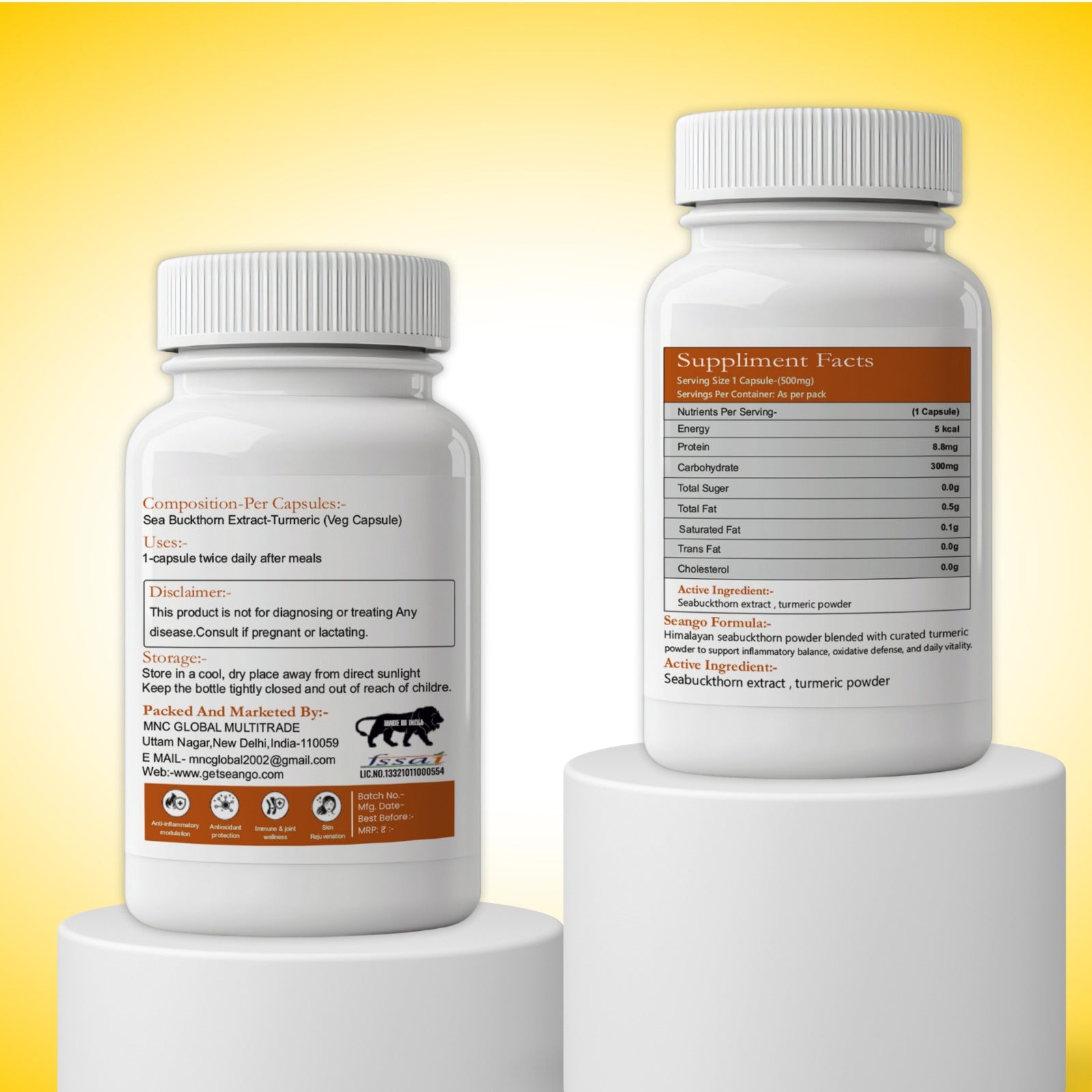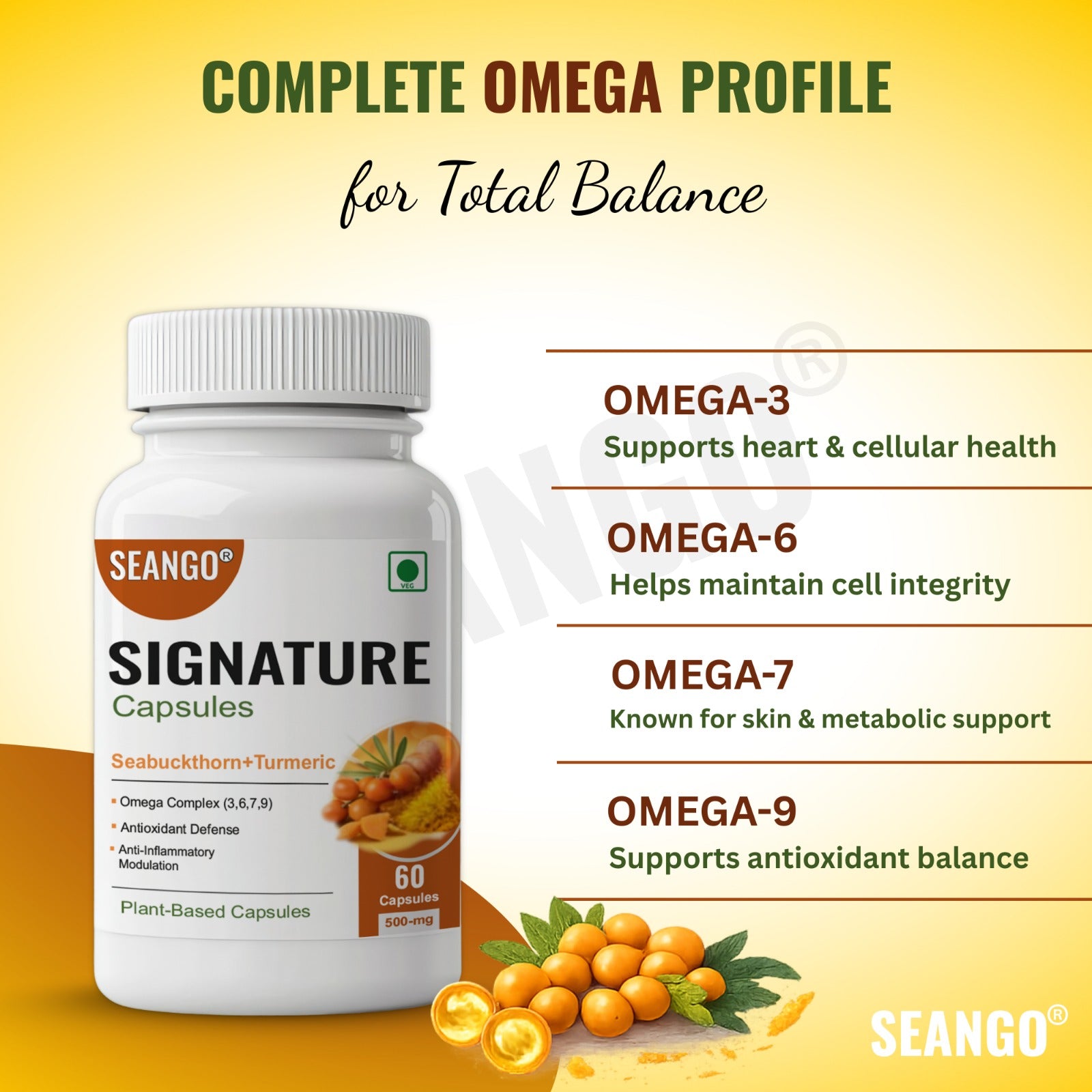 Seango signature capsule is perfect blend of seabuckthorn extract powder and turmeric.which helps in strengthen immunity support gut health reduce dark Spot.seango signature capsule also contains Omega 3,6,7,9 anti-oxident & curumoids. This signature capsule reduces inflammation in your body.